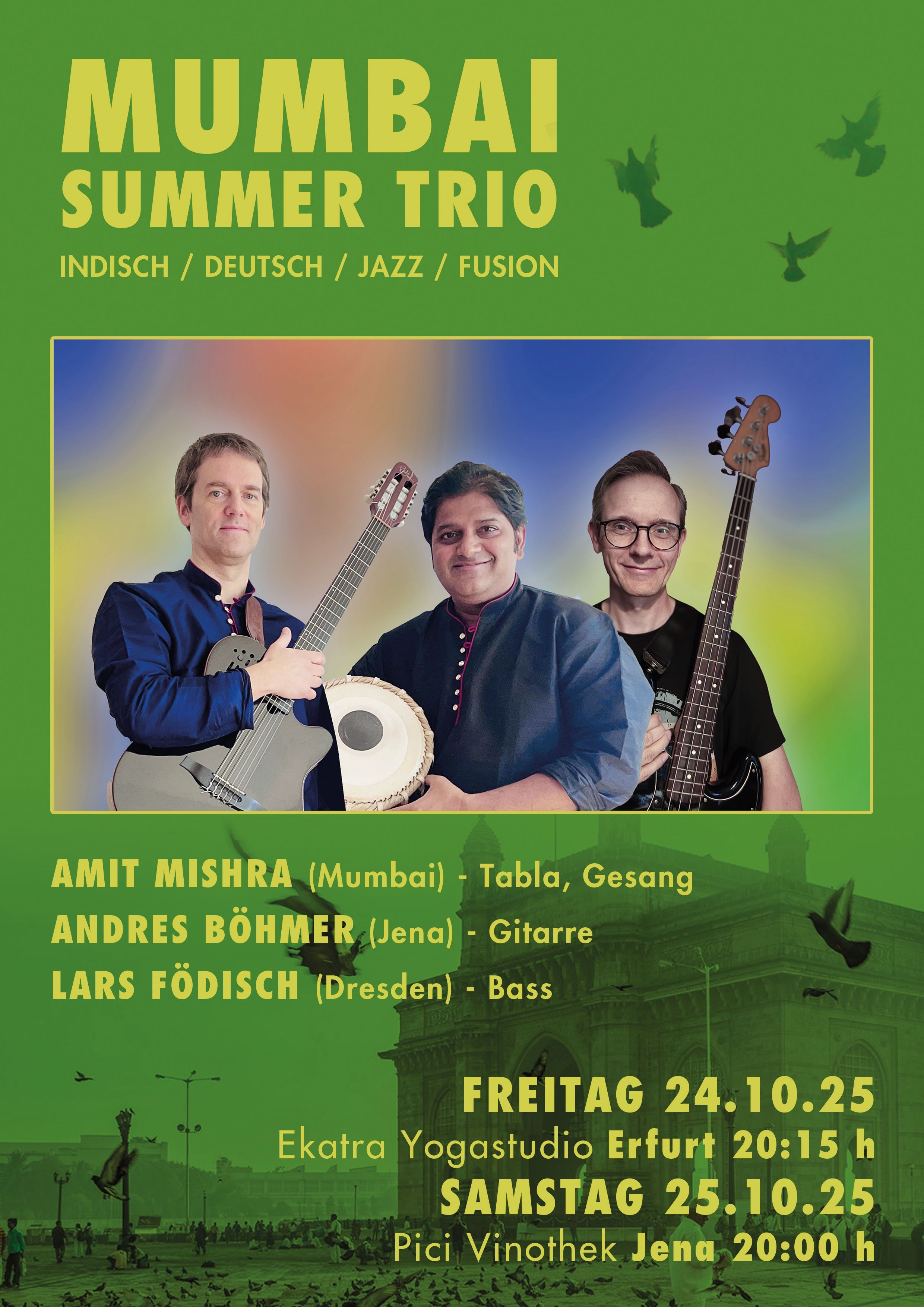Der indische Tablaspieler und Sänger Amit Mishra kommt in Kürze wieder nach Deutschland und ich habe das Vergnügen, 2 Konzerte mit ihm und diesmal noch einem guten Freund aus Dresden bestreiten zu dürfen, als Mumbai Summer Trio:
